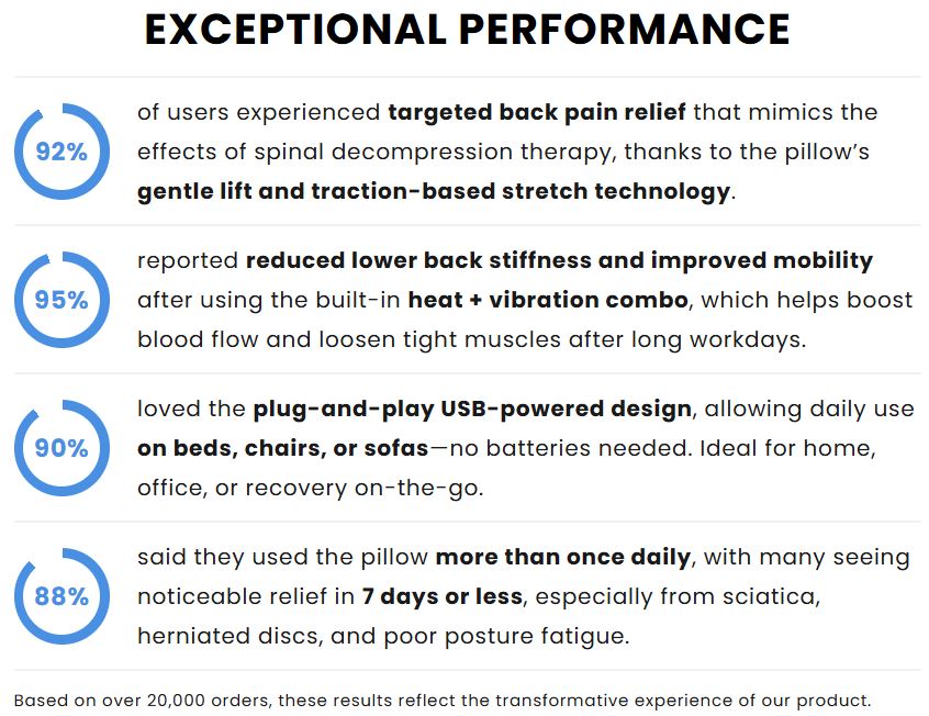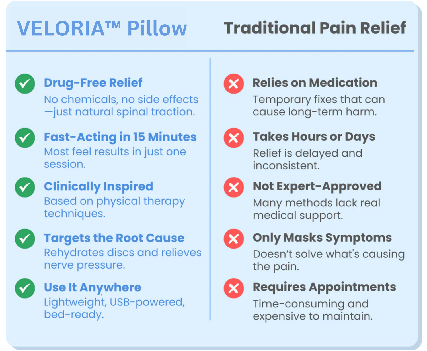 The VELORIA™ 3-in-1 Smart Relief Pillow uses spinal lift, heat therapy, and vibration massage to target the root cause of back pain — not just the symptoms.