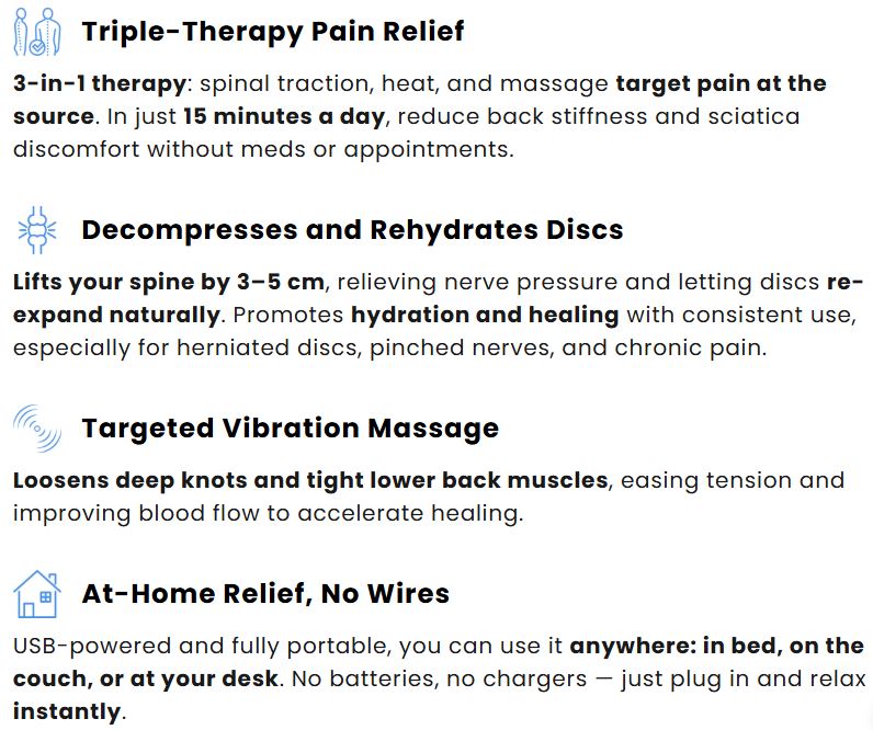It’s non-invasive, works in just 15 minutes a day, and actually supports your long-term spine health—not just masking pain like drugs or heat pads.